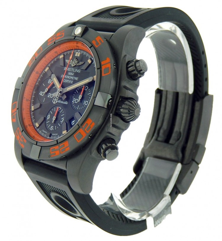 The watch is presented inside a 44 mm case with range accents around bezel, tachymeter ring, subsidiary hands and also the chronograph central seconds hands. Furthermore,. The orange accents clearly standout from the matt black dial, case, hands and bezel.